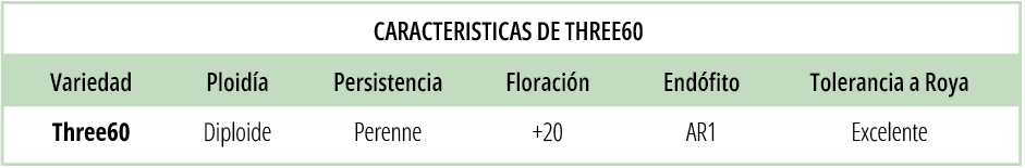Three60 es una ballica perenne diploide de floración tardía. Presenta una fecha de floración muy similar a la reconocida variedad ONE50, lo que la convierte en una alternativa especialmente interesante.