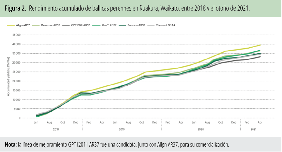 Align presenta una destacada producción de materia seca, con una mejora significativa respecto a su predecesora Halo durante la primavera, además de un hábito de crecimiento extremadamente fuerte en verano, otoño e invierno. El gráfico de rendimiento acumulado destaca que la mejora en la producción es constante.