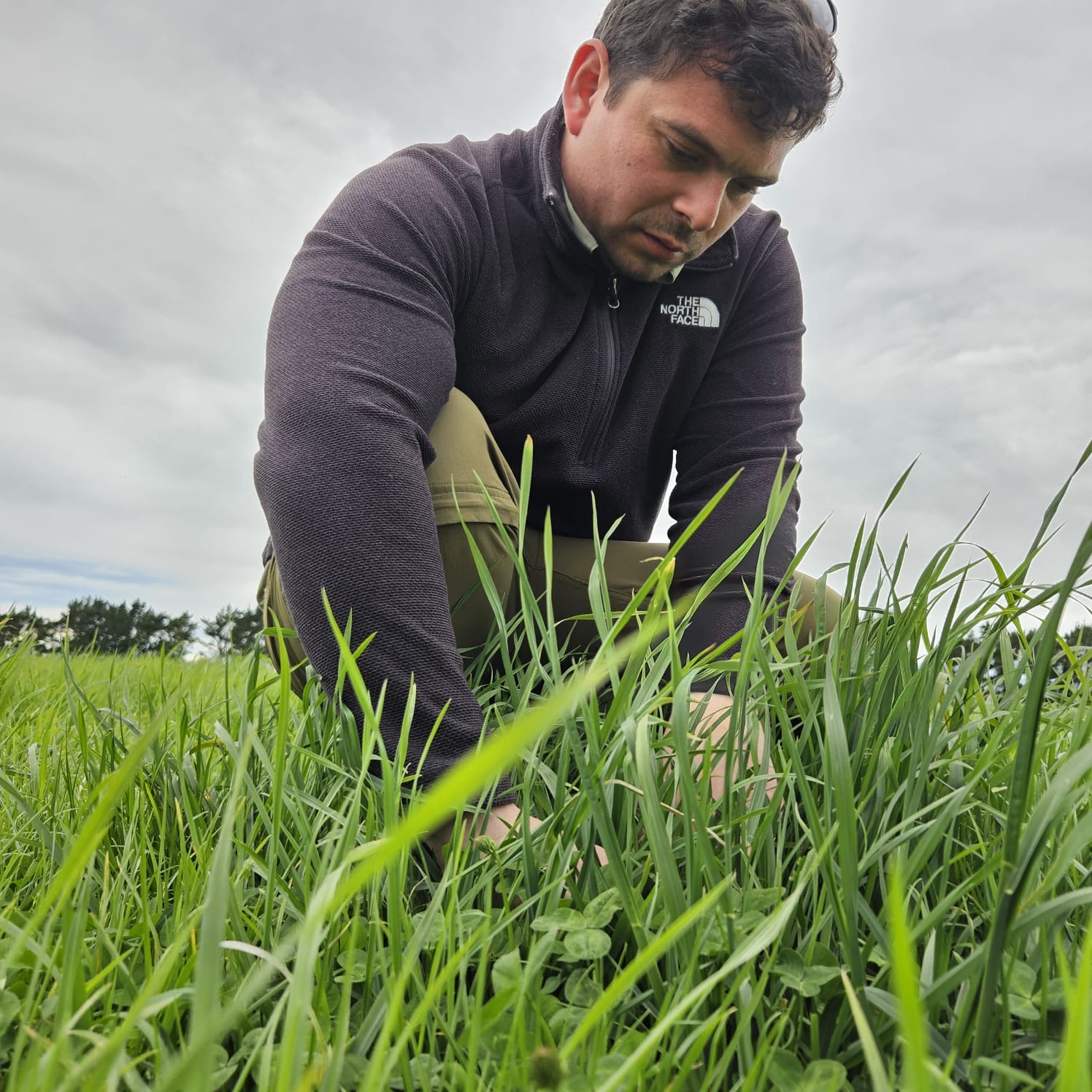 Jean Pierre Loustau, agrónomo del Departamento de Semillas de Cooprinsem, evaluando la interacción funcional entre trébol Brace y ballica Aling, con énfasis en cobertura, compatibilidad y vigor competitivo en pradera mixta.