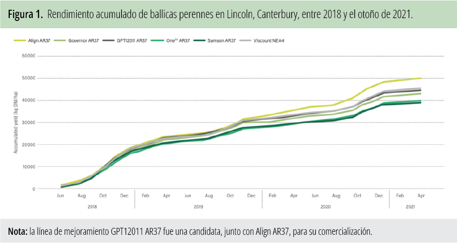 Align presenta una destacada producción de materia seca, con una mejora significativa respecto a su predecesora Halo durante la primavera, además de un hábito de crecimiento extremadamente fuerte en verano, otoño e invierno. El gráfico de rendimiento acumulado destaca que la mejora en la producción es constante.