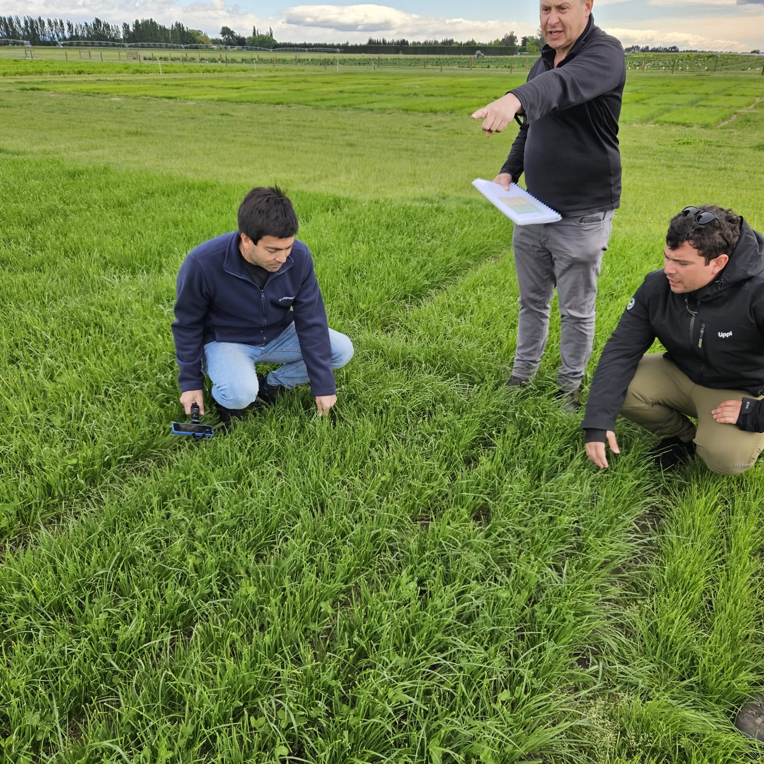 Jean Pierre Loustau, agrónomo del Departamento de Semillas de Cooprinsem, evaluando la interacción funcional entre trébol Brace y ballica Aling, con énfasis en cobertura, compatibilidad y vigor competitivo en pradera mixta.