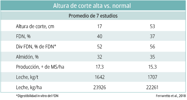 Investigaciones del Dr. Luis Ferraretto (2018), indican que, al comparar alturas de corte de la planta de 17 cm versus 52 cm con relación al suelo, se observa un incremento de hasta 4 puntos en digestibilidad y un disminución del 11,5% del rendimiento en MS.